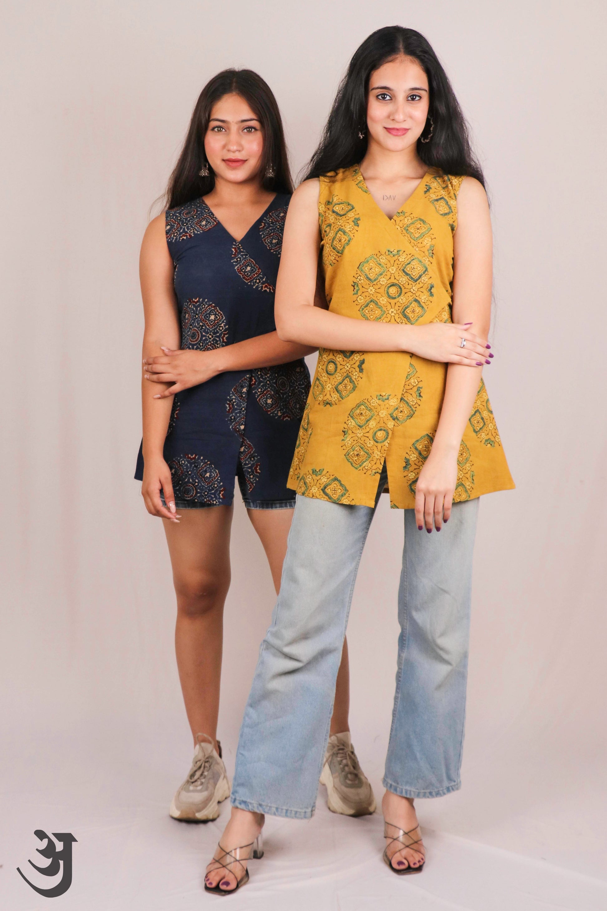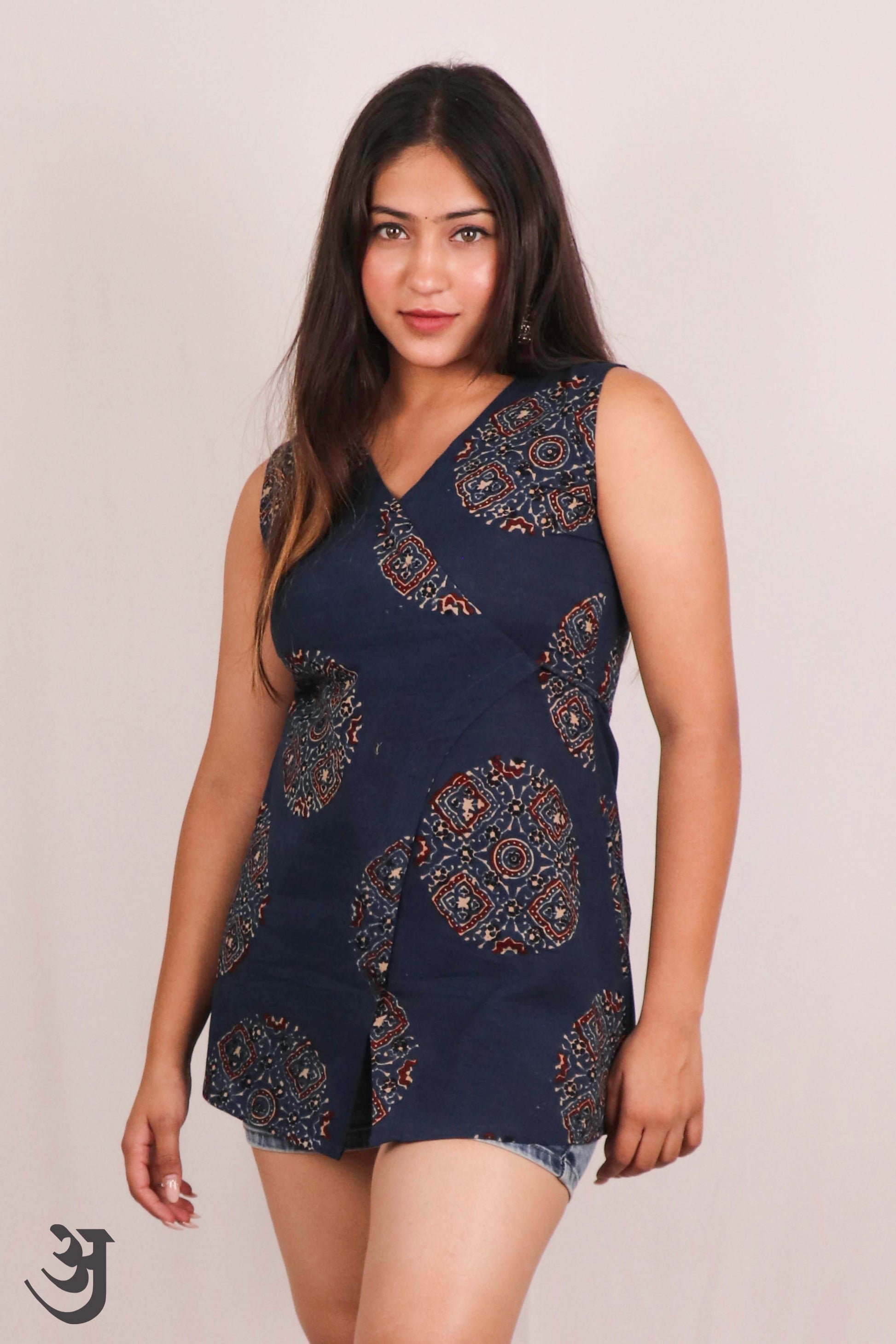 Expertly crafted with traditional techniques, the Blue Ajrakh Short top features a flattering v-neck design and unique hand block detailing. Made from pure cotton, this top has the look of a wrap around, but without the hassle. Elevate your style with this beautiful and authentic piece.