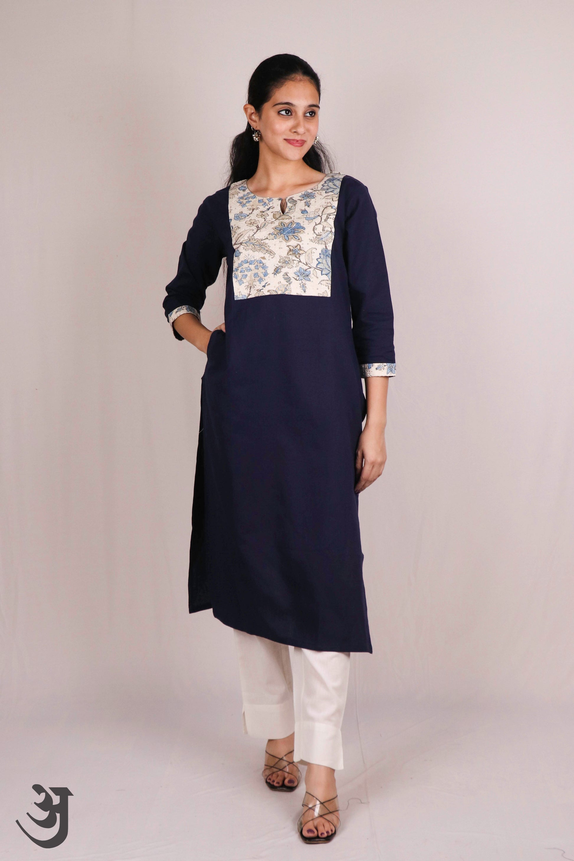 Print : Plain Dark Blue with Floral Cream Yoke