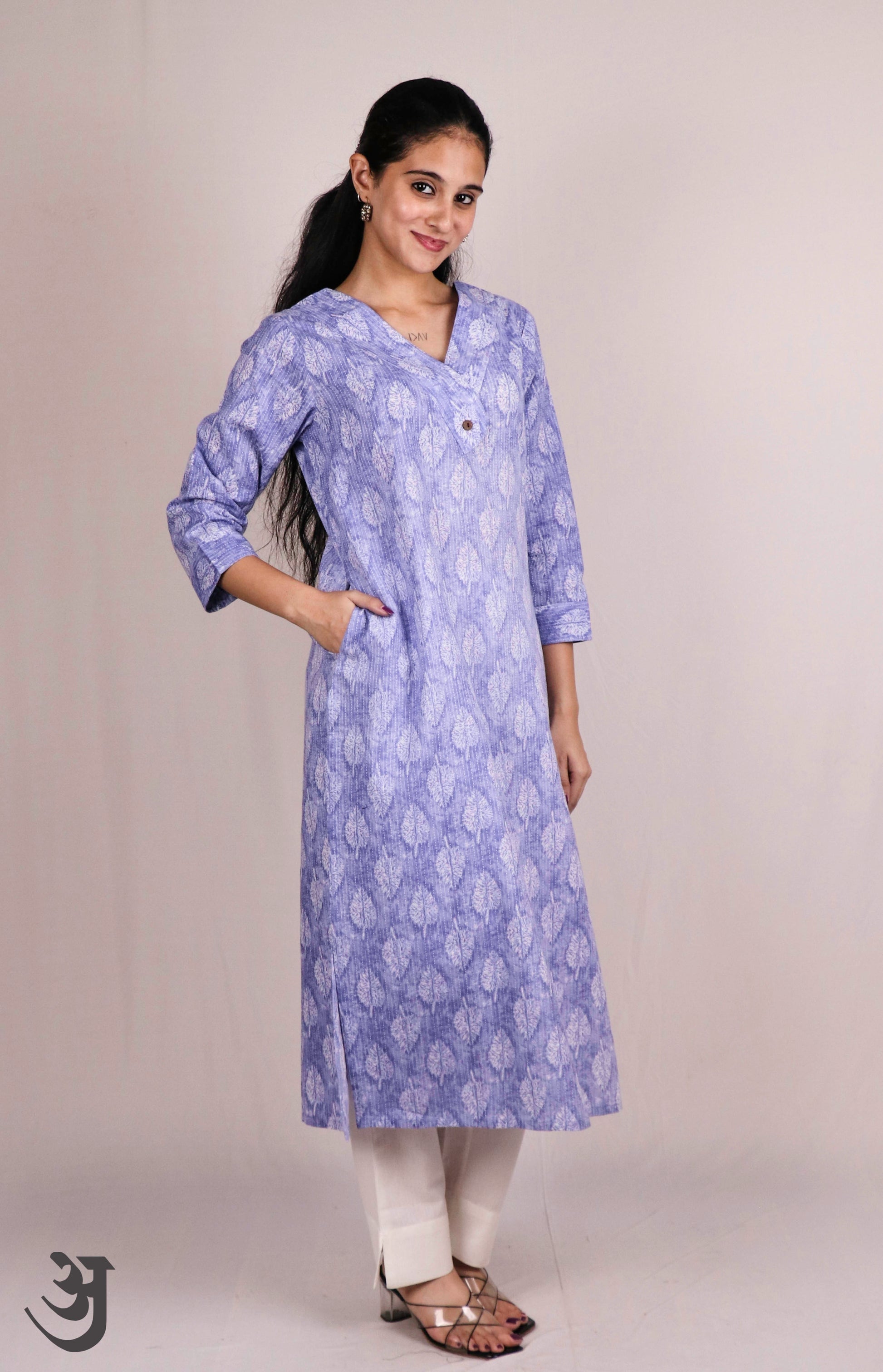 Get ready to turn heads with our Blue Katha Work Kurti! This playful and unique piece features a basic v-neck design and eye-catching cotton screen print. Add a touch of quirkiness to your wardrobe with this must-have item.