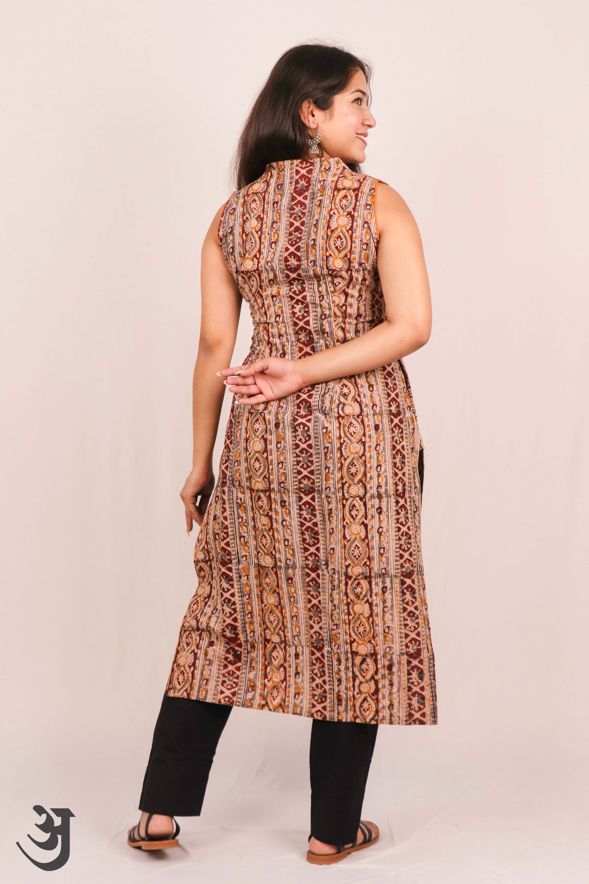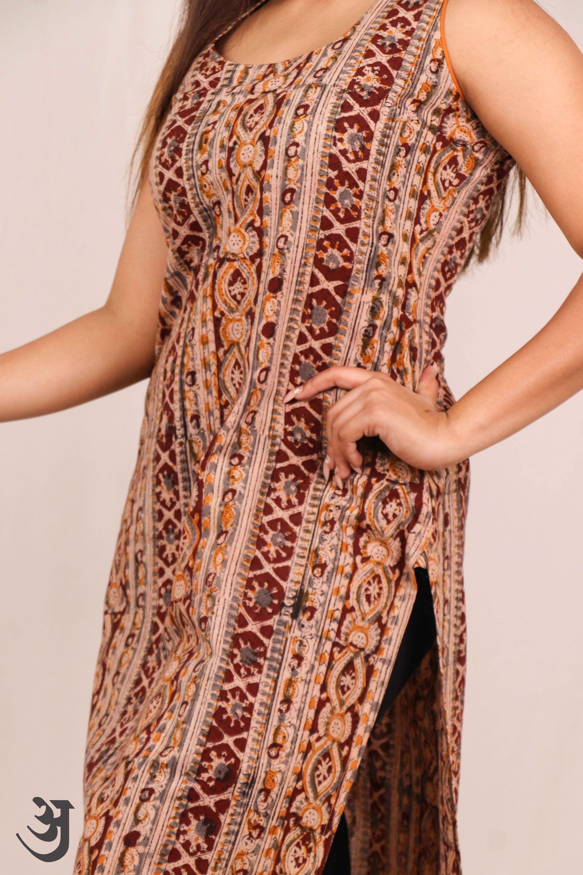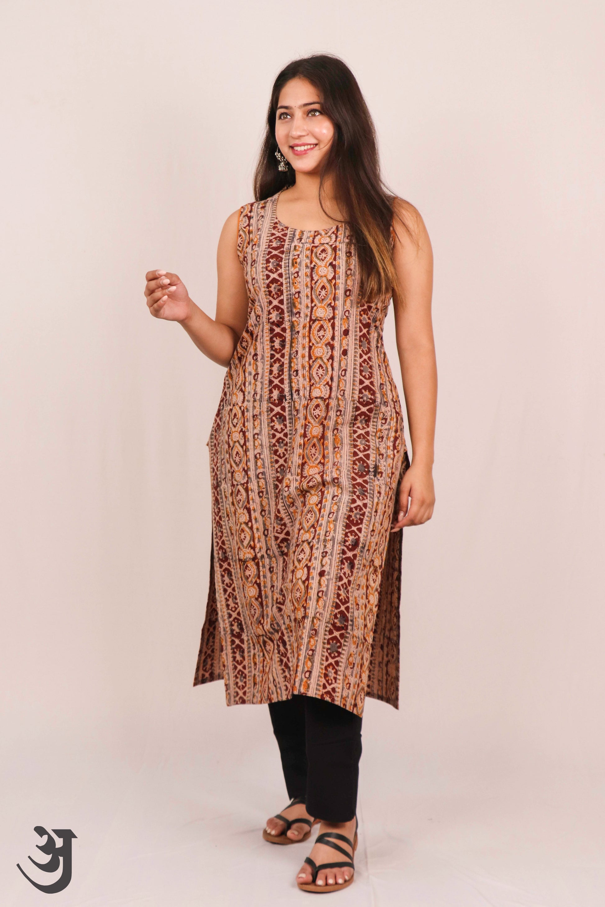 Crafted with intricate Kalamkari designs, this Brown Kurti is a modern twist on traditional Indian fashion. Made from soft and breathable cotton, its halter neck and sleeveless design make it a perfect choice for any casual outing. Elevate your style with this unique and comfortable Kurti.