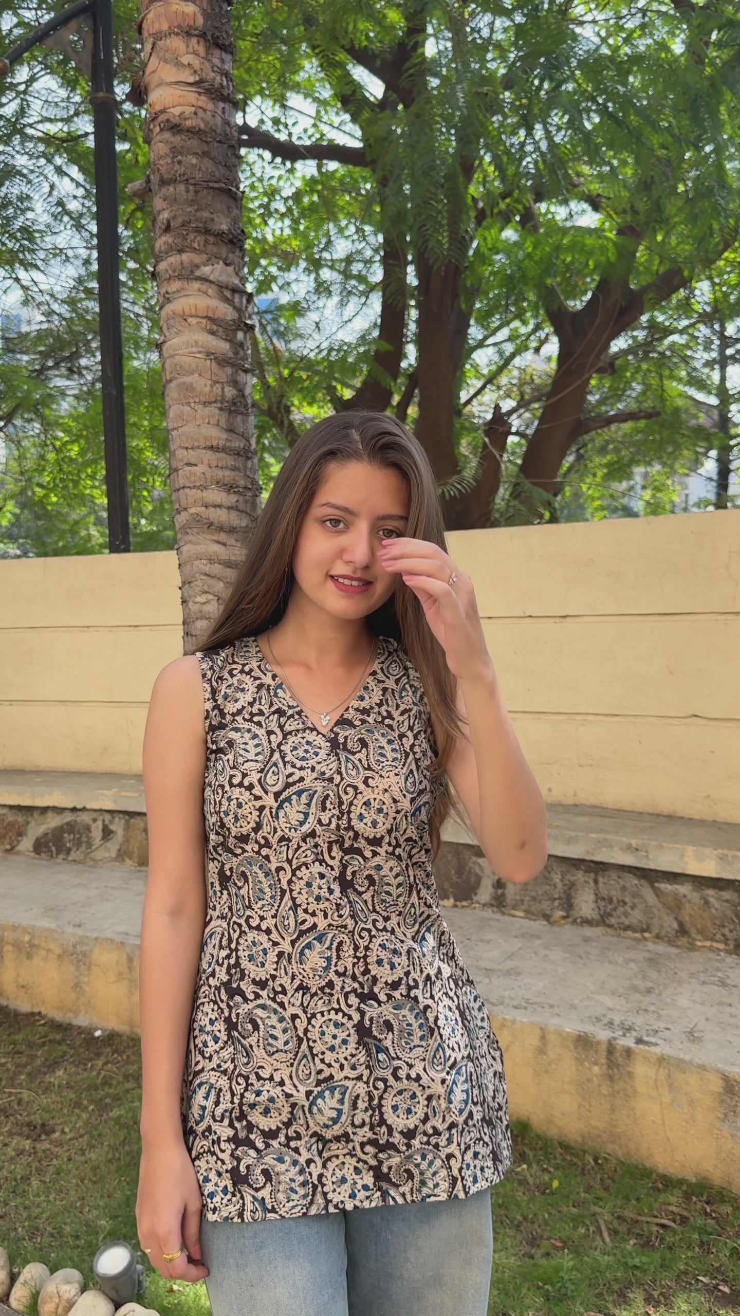 This combo includes three sleeveless Kalamkari short tops made from traditional block-printed fabric, plus a versatile sling bag. Each top comes with detachable sleeves that you can attach whenever you need them, giving you flexibility to style for any season. The included sling bag works perfectly for daily errands, travel, or casual outings. Mix and match the three tops with the sleeves to create multiple looks from one simple combo.