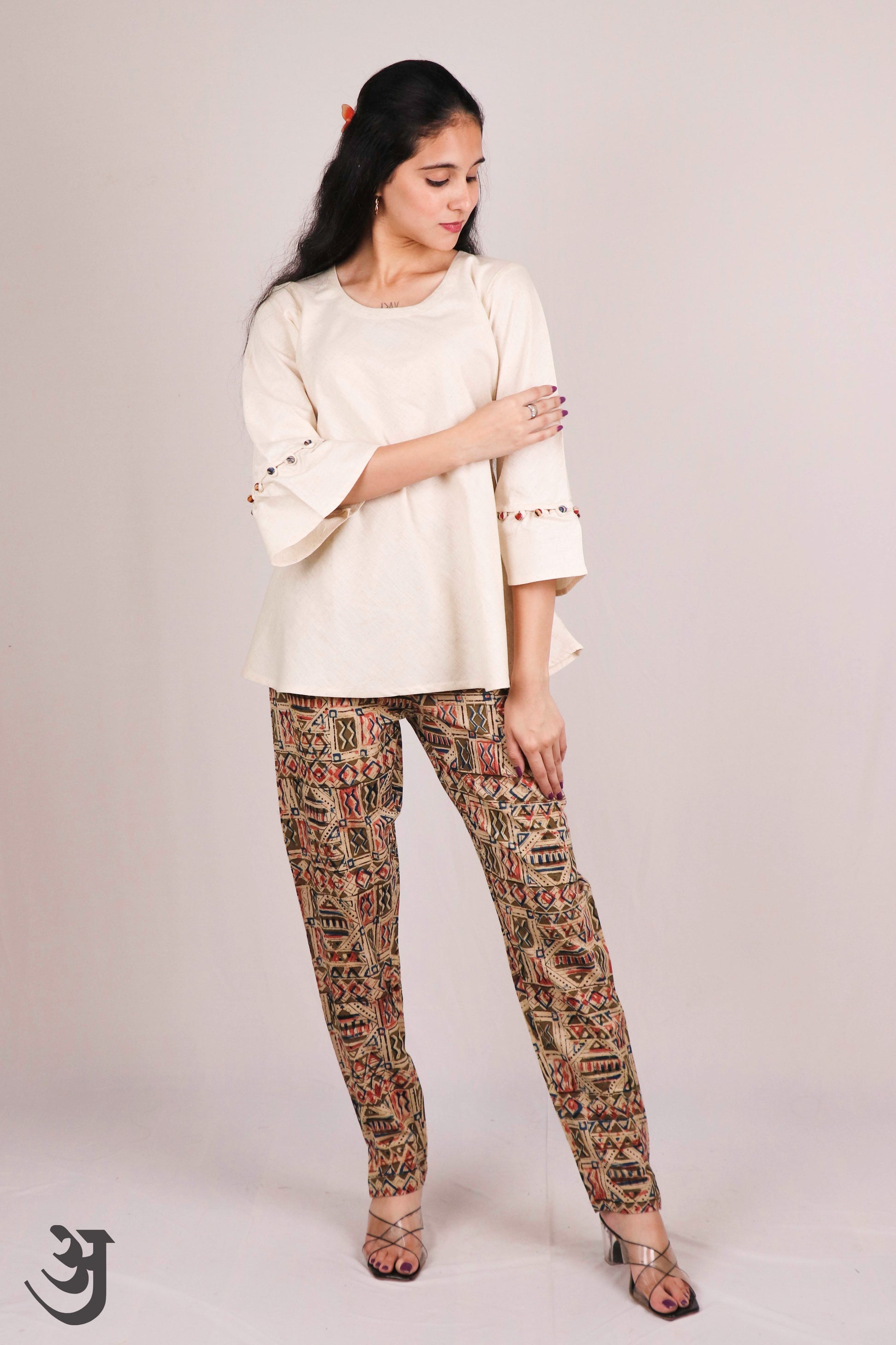 Get ready to slay in our Cream Cotton Flex Short Top! Made with high-quality cotton flex fabric, this top is perfect for a casual day out or a night on the town. The kalamkari waste fabric detailing adds a unique touch to this must-have piece. Upgrade your wardrobe with this one-of-a-kind top!