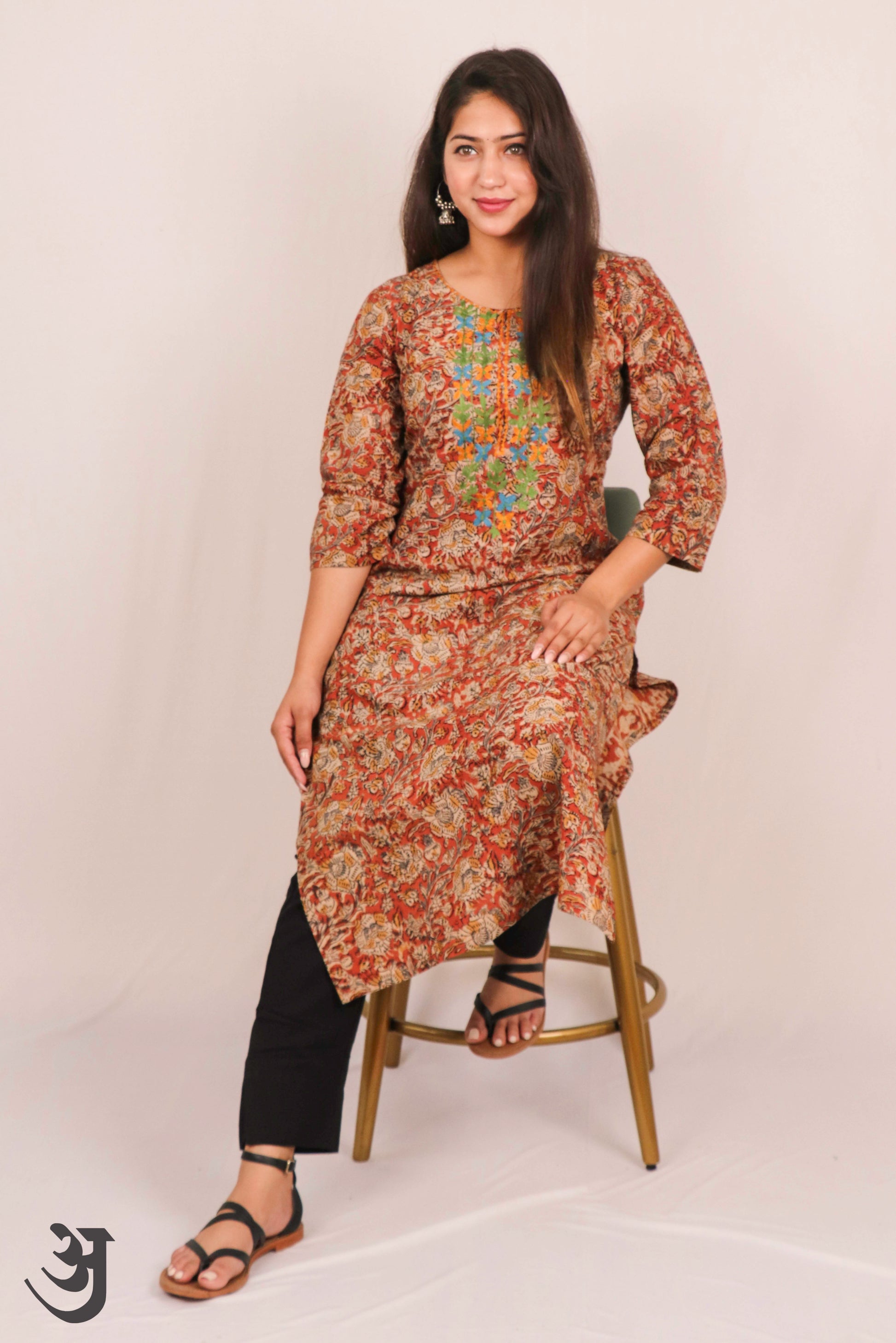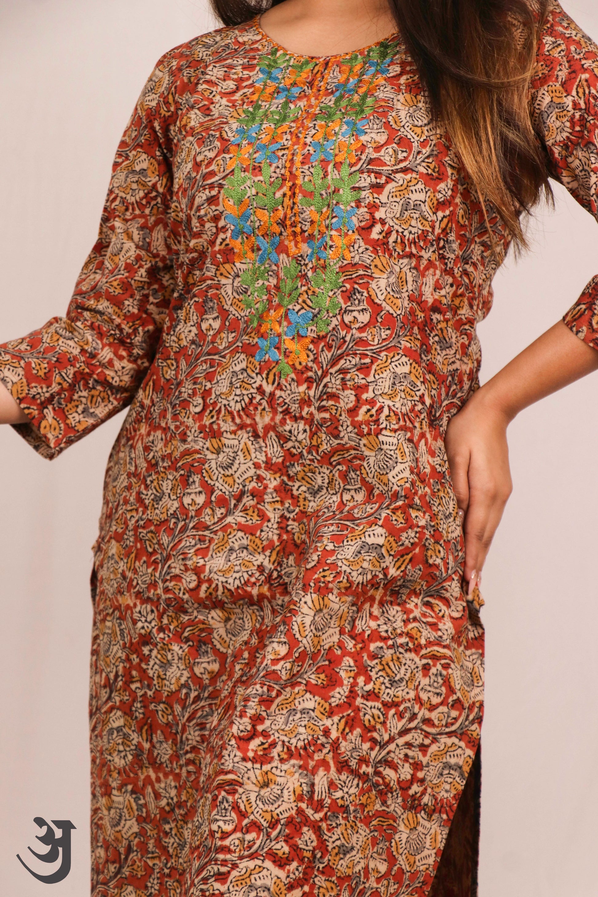 Introducing our Orange Kalamkari Kurti, featuring intricate aari work embroidery. This basic kurti comes in a vibrant orange color, adding a touch of elegance to your wardrobe. Made with high-quality fabric, it offers both comfort and style for any occasion. Elevate your look with this must-have piece.