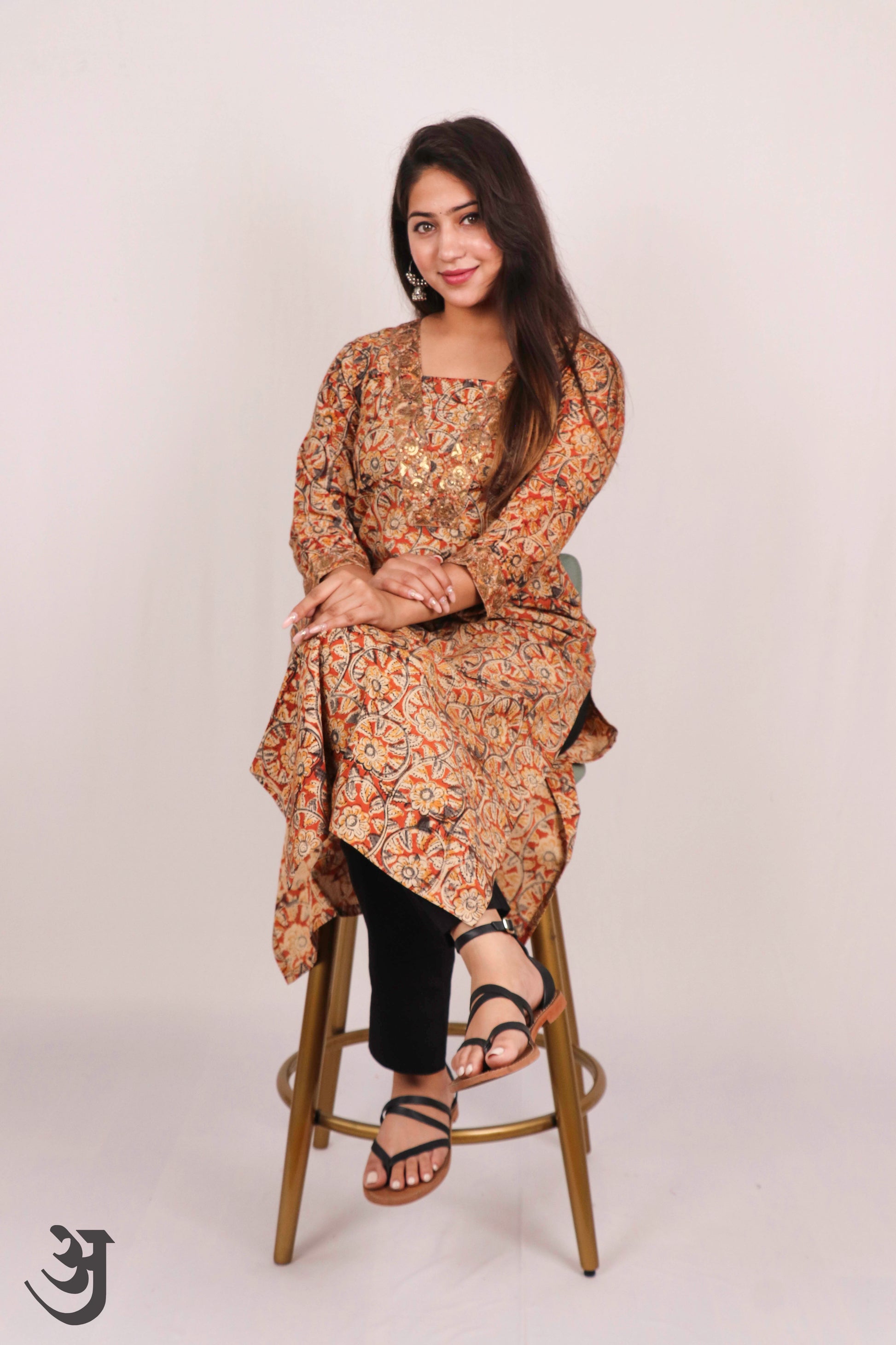 Introducing our Orange Kalamkari V-neck Kurti, expertly crafted with a vibrant orange kalamkari pattern and delicate sequins adorning the neckline. Made from high-quality cotton, this traditional Indian garment is both comfortable and stylish. Elevate your wardrobe with this unique and eye-catching kurti.