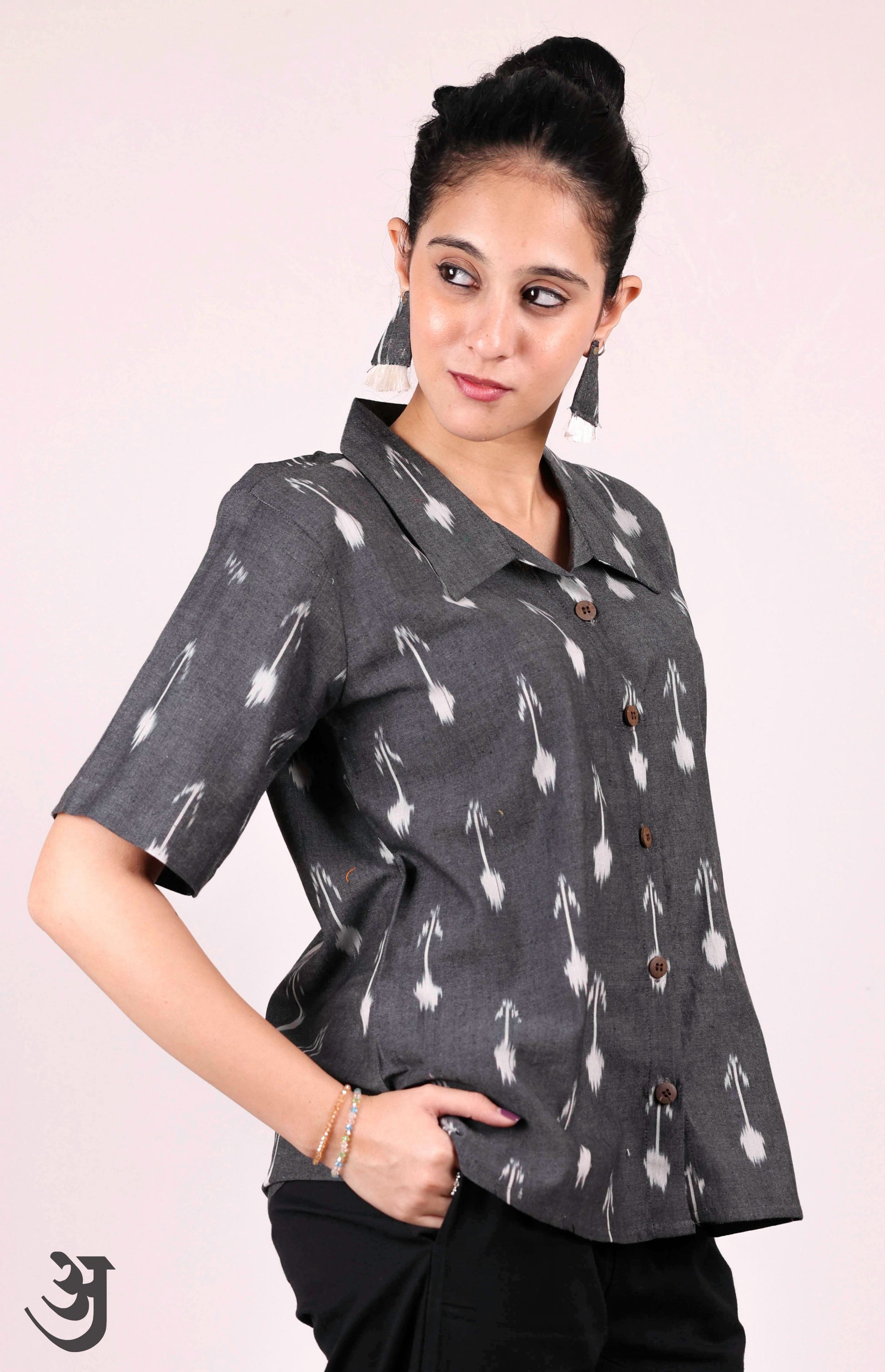 Introducing our Dark Grey Ikat Shirt Top! Made from 100% handloom cotton, this top features a unique dark grey Ikat pattern that will elevate any outfit. Comfortable and stylish, this shirt top is perfect for any occasion. Upgrade your wardrobe with this must-have piece.