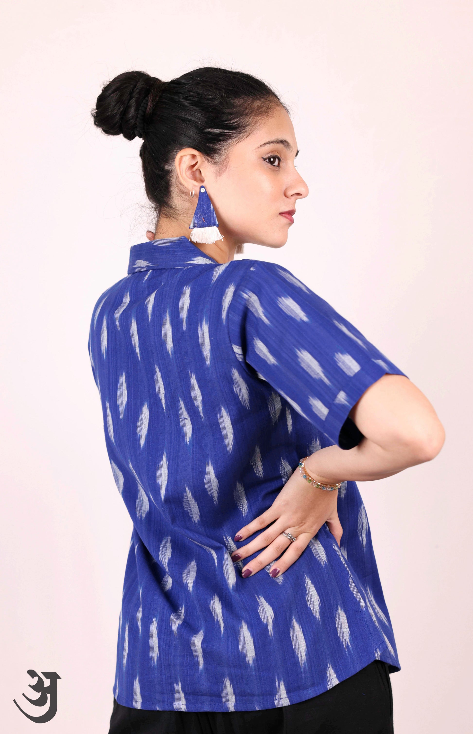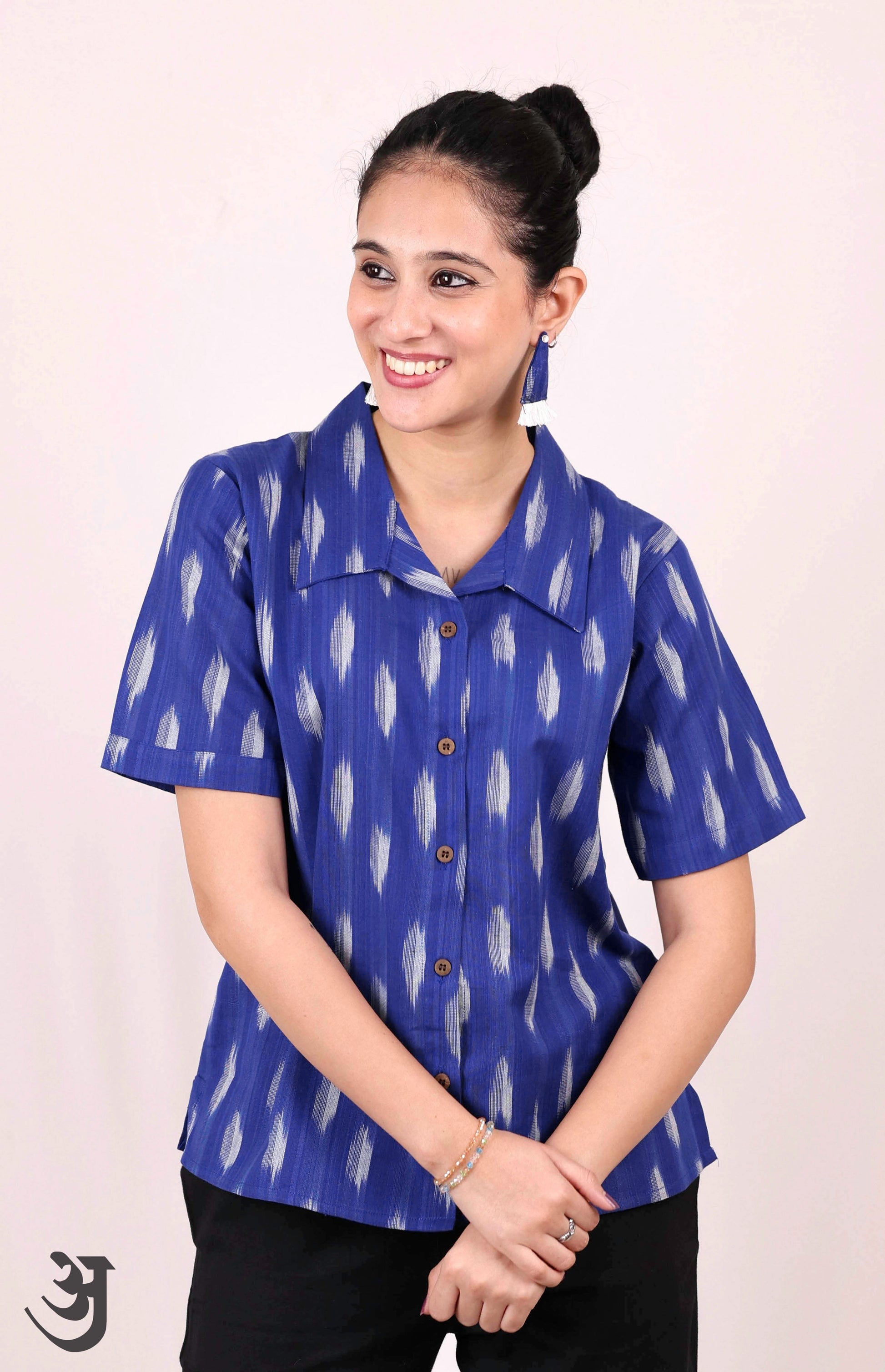 Elevate your style with this playful Blue Ikat Shirt Top. Made from handloom cotton, it's a perfect blend of comfort and charm. Add a unique touch to your wardrobe with this quirky top. (Top off your look with this Blue Ikat Shirt Top. Made from handloom cotton, it's the perfect mix of cool and comfortable. Bring some fun to your wardrobe with this playful top!