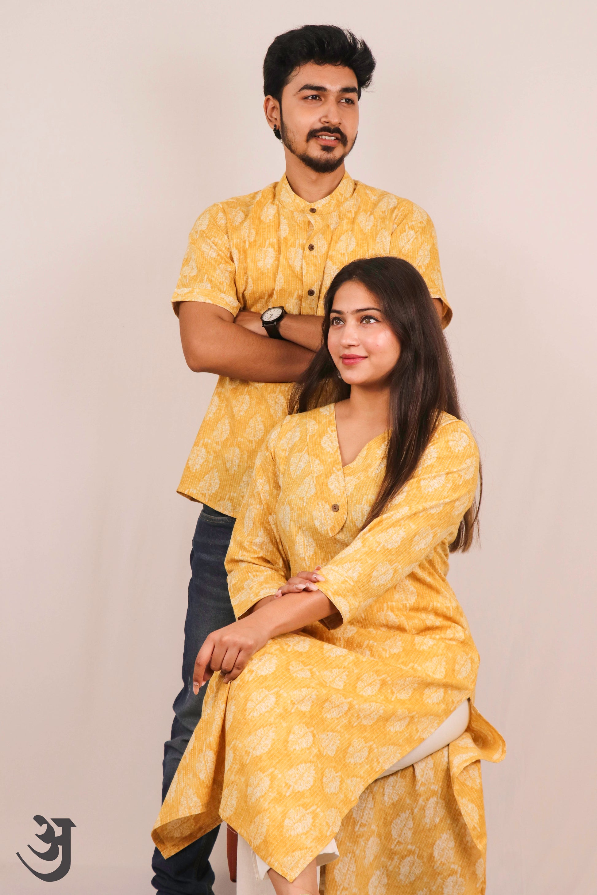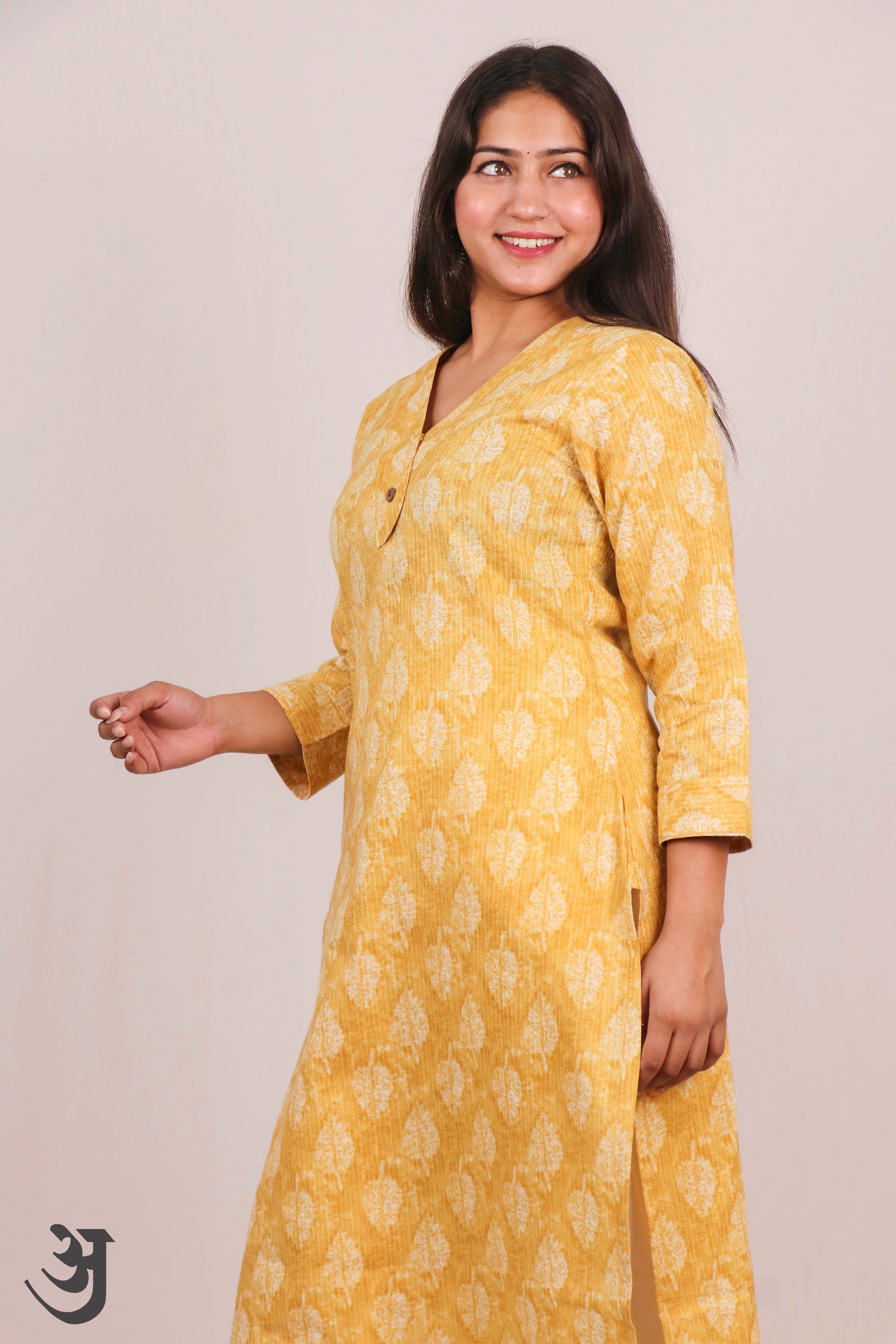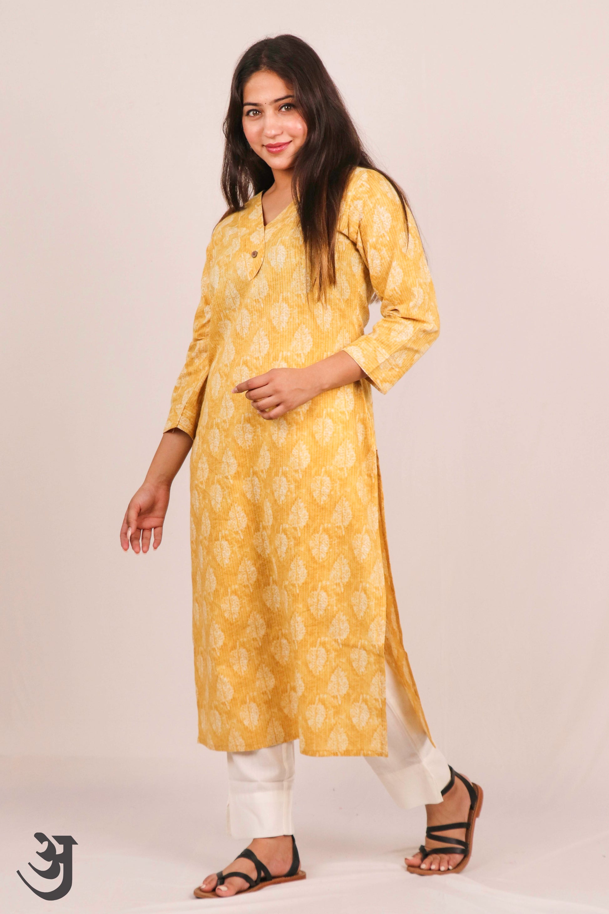Get ready to turn heads with our Yellow Katha Work Kurti! This playful and unique piece features a basic v-neck design and eye-catching cotton screen print. Add a touch of quirkiness to your wardrobe with this must-have item.